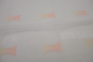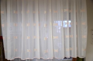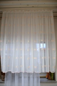 Dnevna zavesa iz enakega materiala kot gubani rolo, s satenasto marelično obrobo.